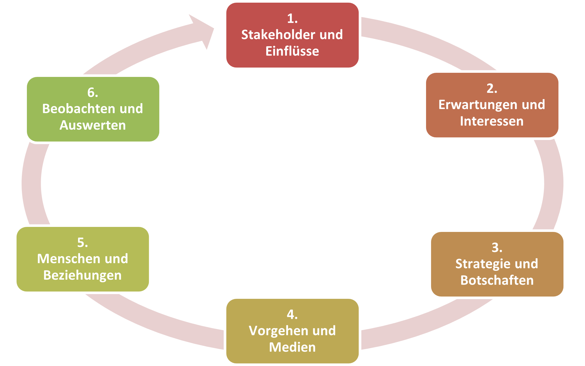 Vergessen Sie nicht, sorgfältig zu beobachten, ob Sie die gewünschten Ergebnisse auch erzielen. Welche Medien und Formate haben sich für welche Zielgruppen bewährt? Ihr Vorhaben ist dynamisch und schreitet voran, also wird sich auch Ihr Umfeld verändern. Manche Stakeholder werden wichtiger, andere verlieren an Bedeutung. Passen Sie Ihre Analyse, Ihre Strategie und Ihre Aktivitäten laufend den Veränderungen an.