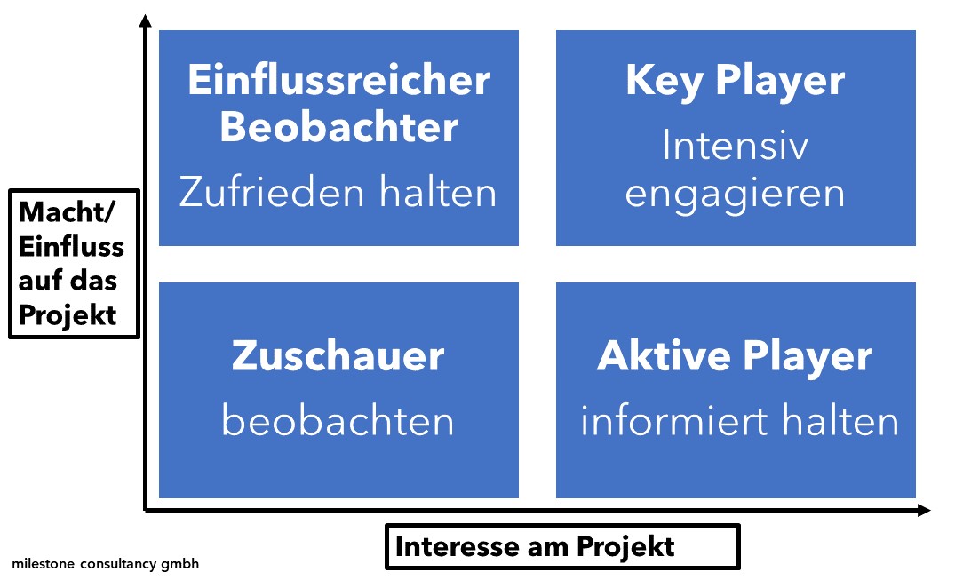 Ich denke, es ist unmittelbar einleuchted, dass eine Überblick über die einflussgeichen Stakeholder bedeutsam ist. Als Projektmanager will ich wissen, wer in Bezug auf mein Projekt wie stark Einfluss nehmen kann. Doch passen Sie auf, es gibt nicht nur die Entscheidungsträger im Projekt und in der Organisation, die aufgrund ihrer Position mächtig sind. Fast ebenso wichtig sind informell Mächtige, die sehr gut vernetzt sind oder an wichtigen Stellen sitzen und gut Stimmung machen können. Unsd vergessen Sie die Gatekeeper, wie Datenschutz, Qualitätsmangement, Rchtsabteilung oder Betriebsrat, nicht. Das sind Personen, die Teile Ihres Vorhabens frerigeben müssen und durch ihr "Nein" große Verzögerungen verursachen können.